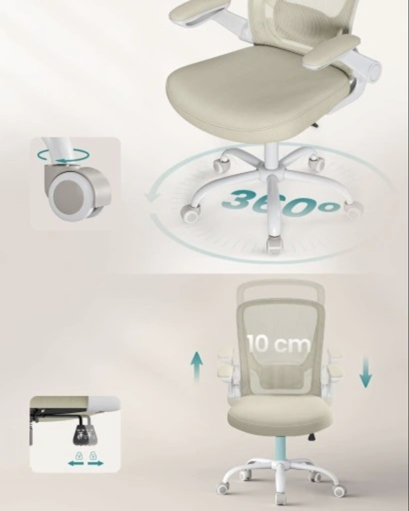 SONGMICS Krzesło biurowe, krzesło biurowe, krzesło obrotowe z pokryciem z siatki, ergonomiczne, wyściełane podparcie lędźwiowe, siedzisko 53 cm, składane podłokietniki, beż owsiany OBN037K02